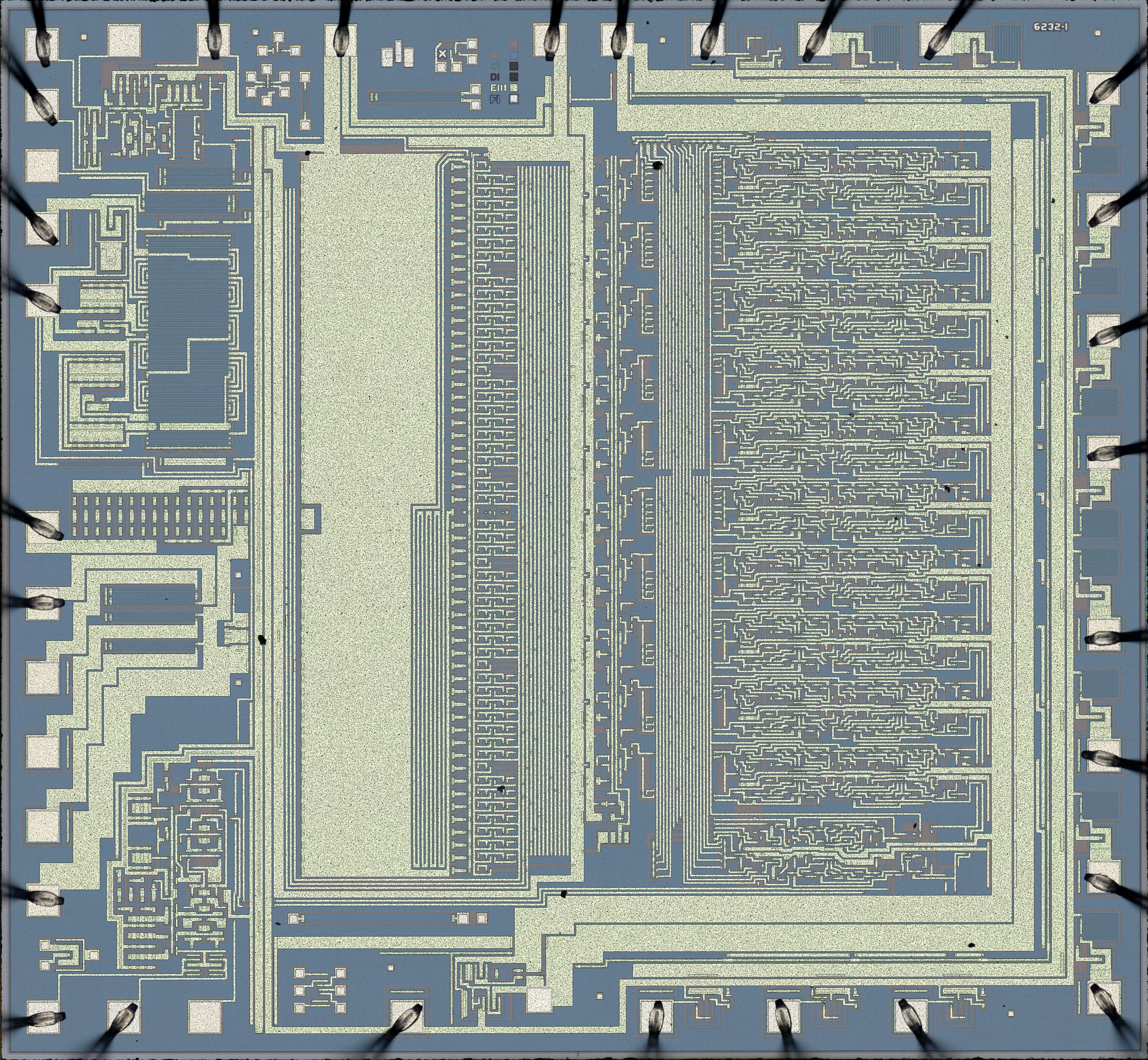 Das zusätzliche Versorgungspotential wird durch einen sehr einfachen Spannungsregler aus dem +5V-Potential erzeugt. Innerhalb des zusätzlichen Potentials befindet sich ein Kontaktpad. Es ist deutlich größer als alle anderen Testpads, aber etwas kleiner als die Bondpads. In der Übersicht im Datenblatt ist dieses Pad nicht gekennzeichnet. Es dient wohl lediglich Testzwecken, vielleicht für regelmäßigere Tests, bei denen ein größeres Kontaktpad wünschenswert war.