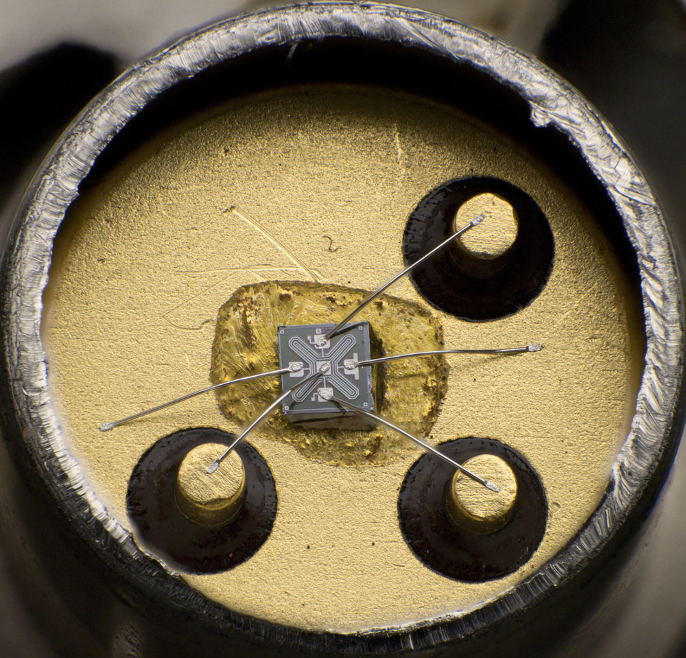 Das Sourcepotential des MOSFETs ist über zwei Bonddrähte mit dem Gehäuse verbunden.