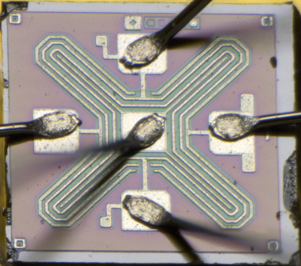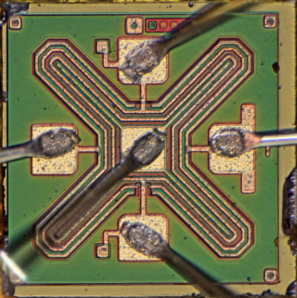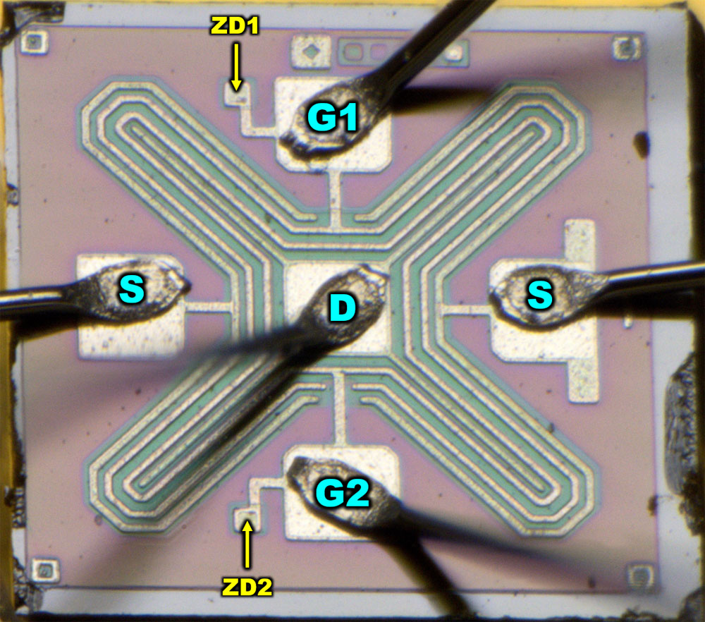 Die kreuzförmige Struktur des MOSFETs bietet eine deutlich größere aktive Fläche als im SD304. Das erklärt die höhere Stromtragfähigkeit und die höhere Steilheit, aber auch die höheren parasitären Kapazitäten. Die Hilfsstrukturen in den Ecken und an der oberen Kante sind die gleichen die man sie auch im SD304 findet.