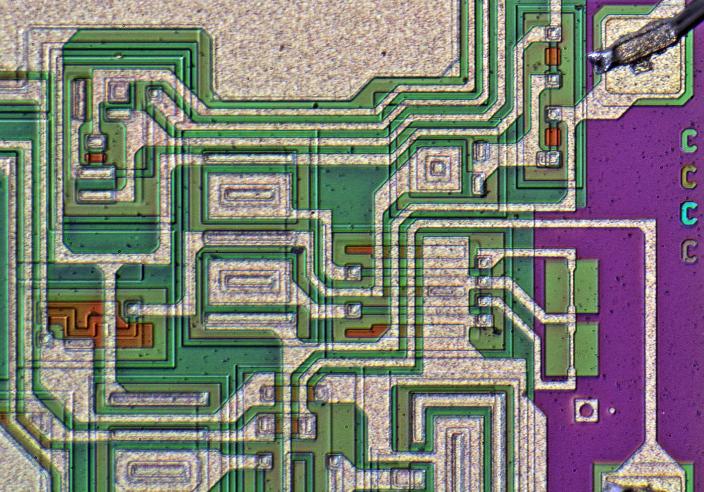 Vergleicht man das Die mit dem Die im Raytheon LM318, so stellt man fest, das das Design sehr ähnlich ist. Es sind viele Strukturen anders aufgebaut, die grundsätzlichen Schaltungsblöcke sind aber an den gleichen Stellen platziert. Vor allem der Ausgang in der rechten oberen Ecke gleicht dem LM318 von Raytheon.