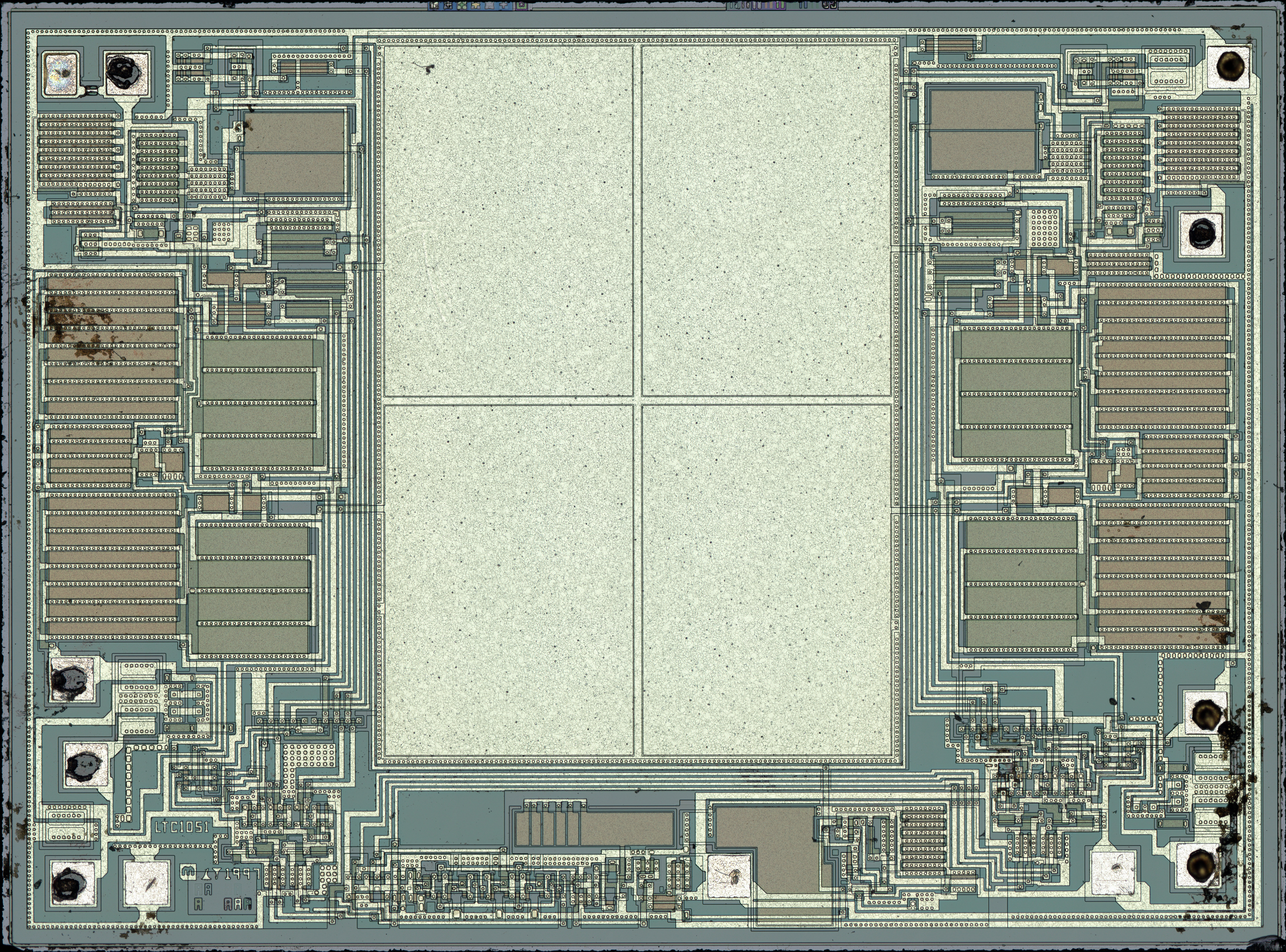 Im unteren Bereich befinden sich außerdem drei ungenutzte Bondpads. Es handelt ich um zusätzliche Möglichkeiten die Versorgungspotentiale anzubinden. Das Bondpad in der oberen linken Ecke ist über eine Fuse mit einem Testpad verbunden. Für was genau diese Fuse genutzt werden könnte bleibt unklar.