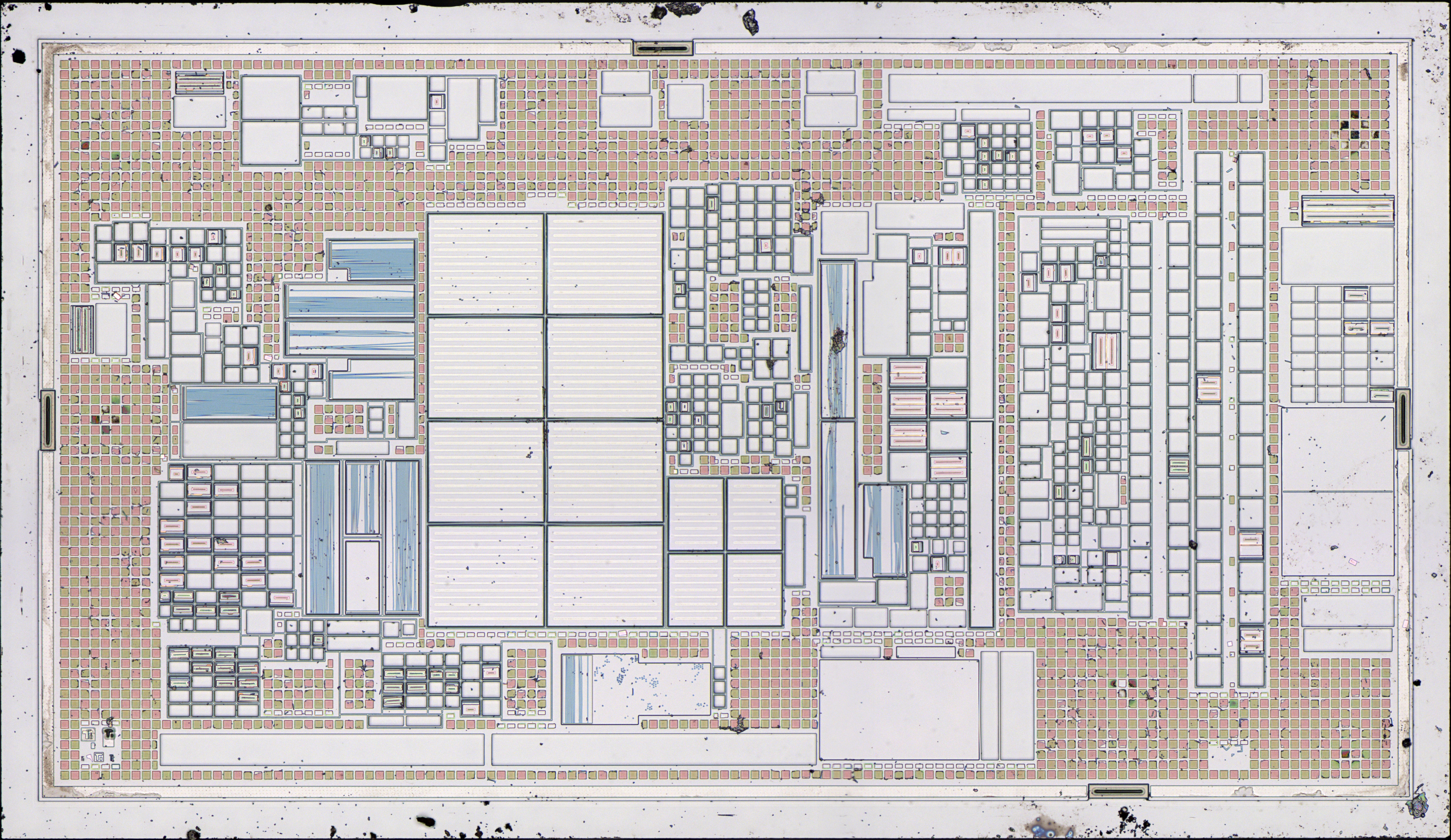 Die Abmessungen des Dies betragen 1,4mm x 0,8mm. Der hohe Integrationsgrad macht es schwierig einzelne Funktionsblöcke zu erkennen. Die breiten Leitungen im rechten Bereich zeigen, wo sich die Endstufe befindet. Dort sind neben dem Ausgang auch die Bondpads der Versorgung platziert, so dass die verhältnismäßig hohen Ströme keine weiten Wege zurücklegen müssen. Drei Bondpads wurden nur während der Produktion kontaktiert. In den blauen Flächen meint man teilweise Spuren eines Laserabgleichs erkennen zu können. Unter der massiven Struktur links der Mitte scheinen sich die Eingangstransistoren zu befinden. Die Kontakte sprechen für eine verschachtelte Kontaktierung, die Temperaturdrifts entgegen wirkt.