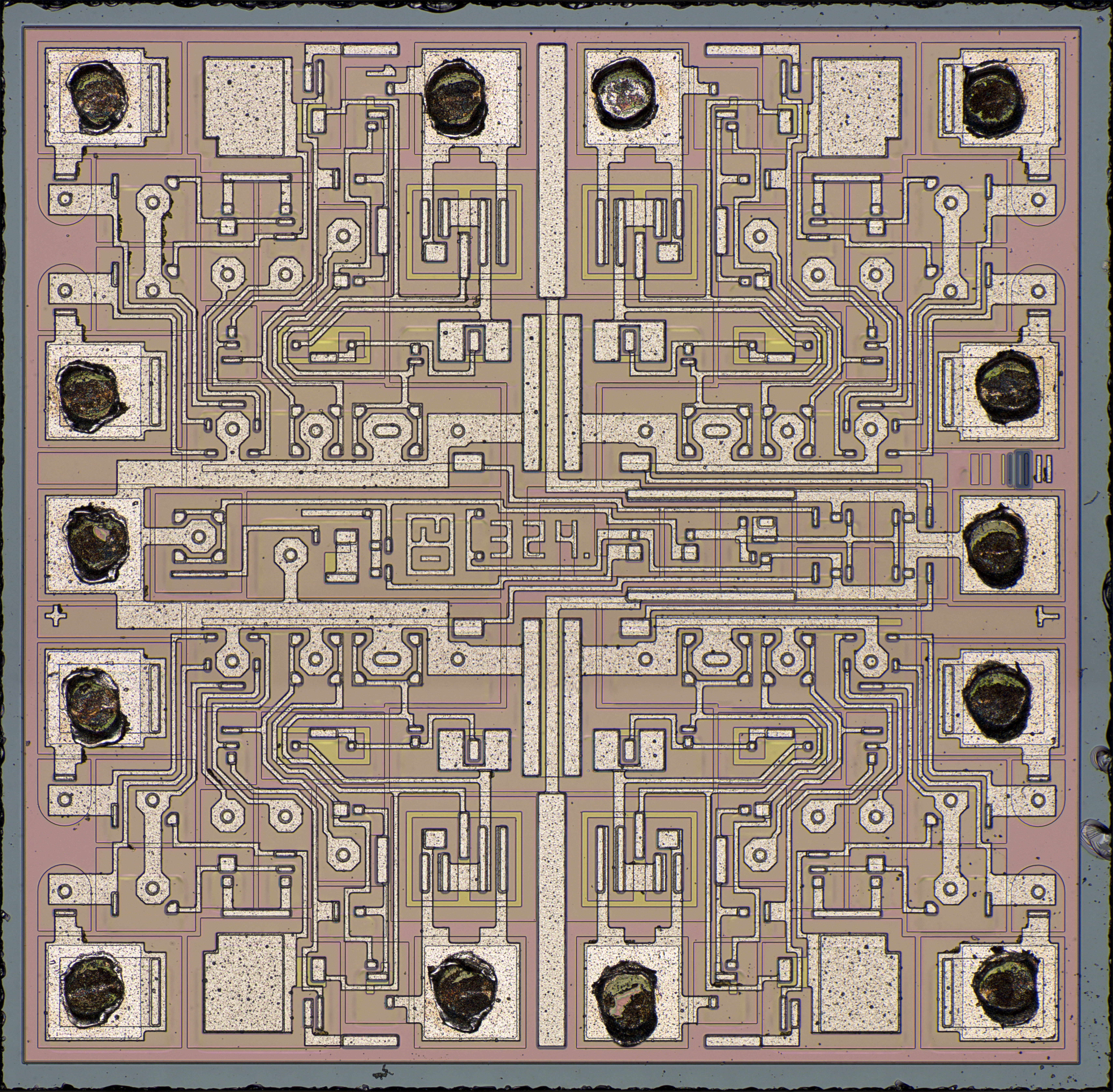 Auf dem Die befinden sich vier Operationsverstärker. Der Hersteller ist unklar. In der Mitte des Dies sind lediglich die Zeichenfolgen 20 oder 02 und 324 abgebildet. Ein schönes Details sind das + und das Masse-Zeichen an den Bondpads der Versorgung.