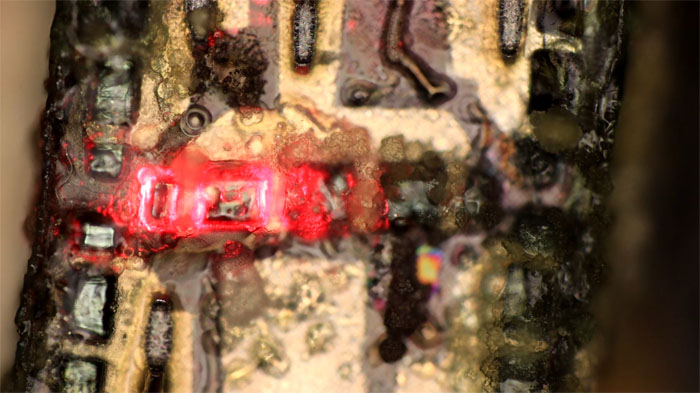 Teilweise entstanden an den Leuchtdioden große Ausblühungen. Kaliumhydroxid reagiert stark mit Aluminium, Zinn und Blei, aber auch mit Galliumarsenid. Rote Leuchtdioden basieren üblicherweise auf Galliumarsenid.