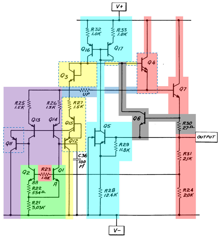 Der zur Bandgap-Referenz gehörende Stromspiegel, der für gleiche Ströme in den beiden Pfaden sorgt, ist violett hinterlegt. Die Transistoren Q13/Q14 stellen den eigentlichen Stromspiegel dar. Der Transistor Q11 kompensiert den Basisstrom des Stromspiegels, der zu Unsymmetrien in den Zweigen führen würde.