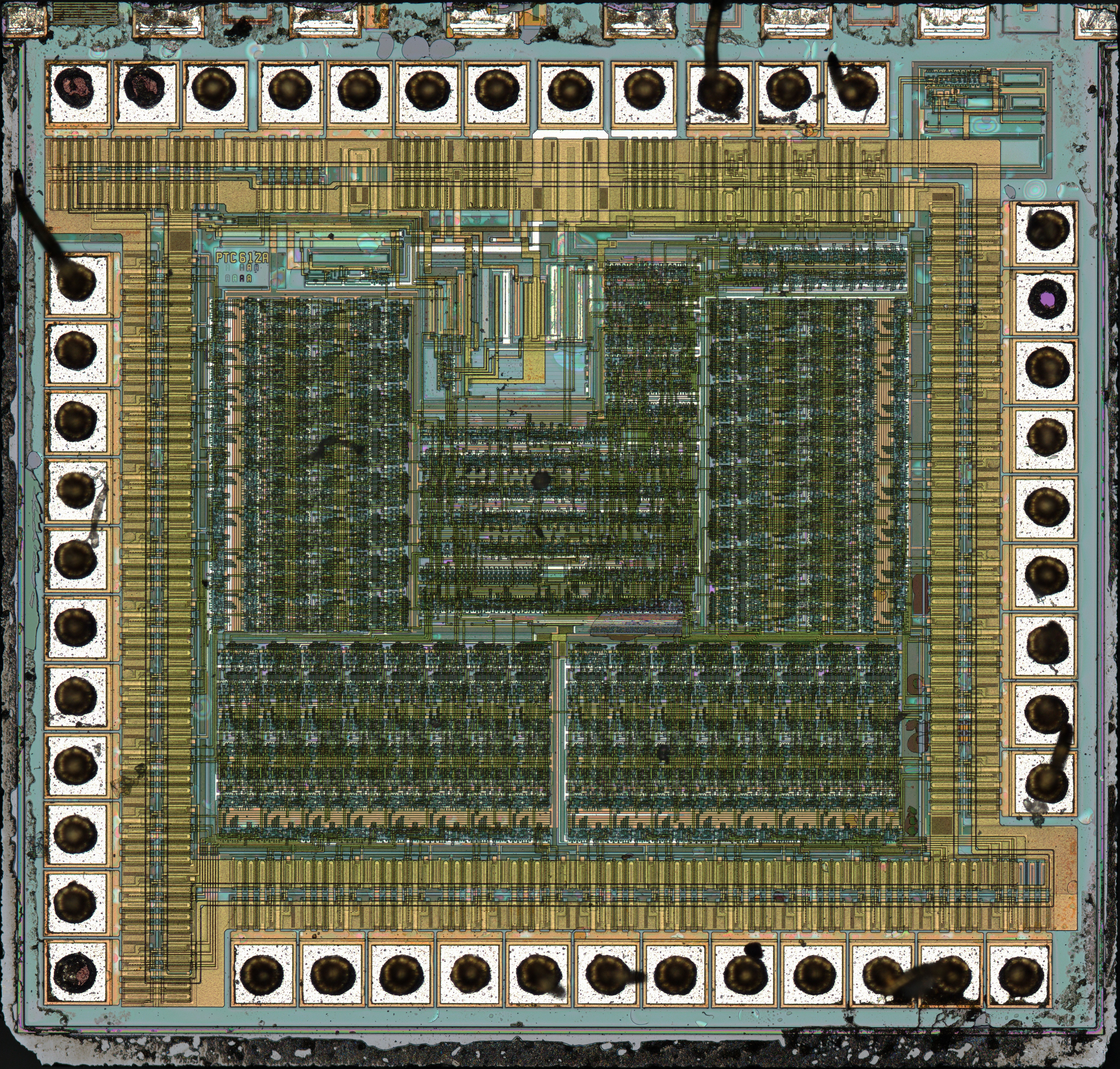 Die Abmessungen des Dies im PT6596 betragen 1,7mm x 1,6mm. Wie beim PT6523 sind hinter den Bondpads die Endstufen platziert. Im Inneren des Dies befindet sich die Steuerungslogik. Es sind vier ähnliche Blöcke zu erkennen, die anscheinend die Ansteuerung der 32 Segmente realisieren. Im Zentrum und im oberen Bereich ist weitere Logik integriert. Dort finden sich außerdem die notwendigen Hilfsschaltungen.