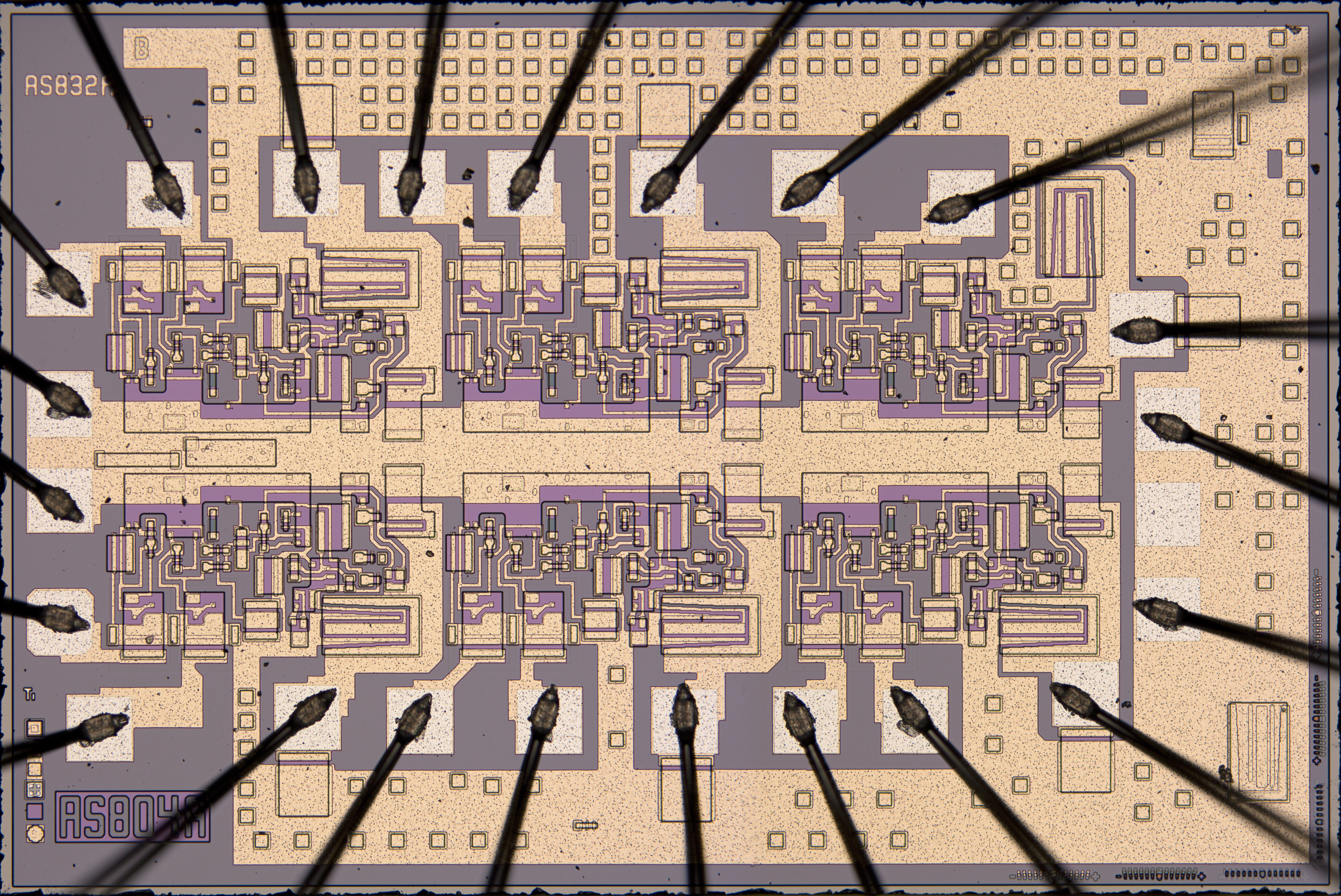 Die Abmessungen des Dies betragen 2,5mm x 1,7mm. In der oberen linken Ecke befindet sich in der Metalllage die Zeichenfolge AS832A, ein Verweis auf die Bezeichnung des Bausteins. Interessant ist die Zeichenfolge AS804A in der unteren linken Ecke. Sie befindet sich in einer tieferen Lage. Offenbar stellt der SN54AS804 die Grundlage dar, die mit einer anderen Metalllage in einen SN54AS832 umkonfiguriert werden kann. Der SN54AS804 enthält sechs NAND-Treiber mit jeweils zwei Eingängen.