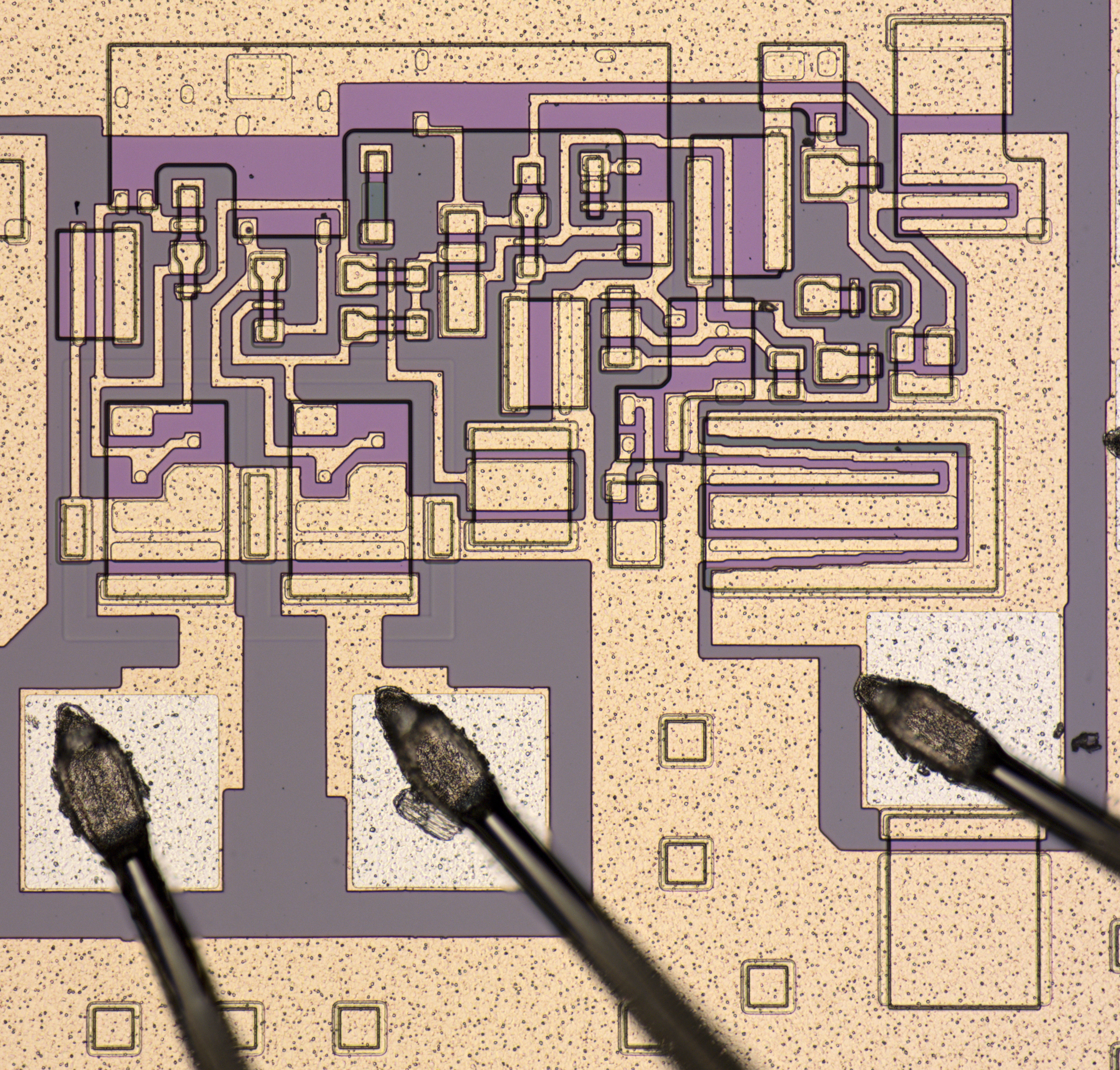 Die realen Strukturen lassen sich nicht ohne Weiteres erklären. Auf den ersten Blick erinnern die Transistoren eher an MOSFETs. Offenbar setzen sich nicht alle Bereiche optisch ab. An mehreren Stellen müssten sich Widerstandsstreifen befinden. Hier sind im linken oberen Bereich zwei entsprechende Kontakte zu erkennen. Der Widerstandsstreifen selbst ist nicht sichtbar.