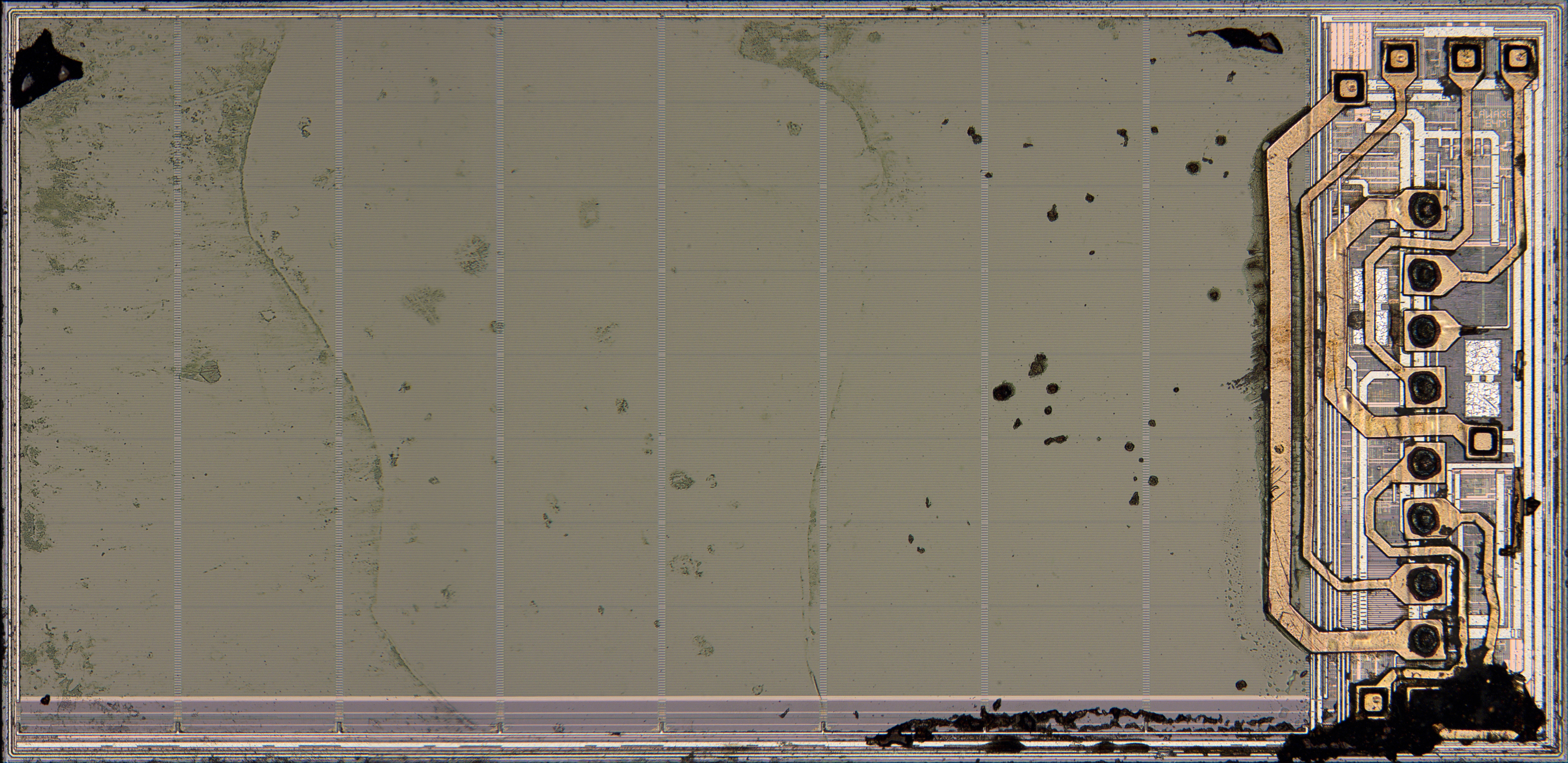 Lässt man eine Zeit lang Flusssäure auf das Die einwirken, so bekommt man einen Eindruck vom Aufbau des Digitalteils. Man kann einige Speicherblöcke mit den für Speicher typischen gleichmäßigen Strukturen erkennen.
