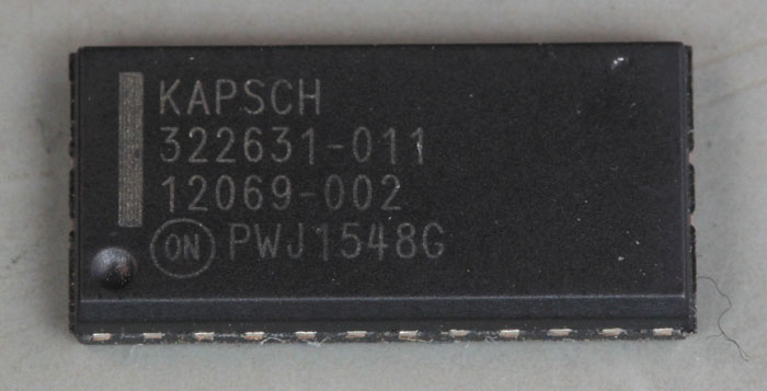 Die eingekreisten Buchstaben ON zeigen, dass der Chip von ON Semiconductor gefertigt wurde. Die Beschriftung ist kundenspezifisch. Sie verweist auf die österreichische Firma Kapsch TrafficCom, die intelligente Verkehrssysteme entwickelt. Die Zeichenfolgen 322631-011, 12069-002 und PWJ1548G könnten für den zugrunde liegenden Schaltkreis, eine HW-Variante oder eine SW-Version stehen.