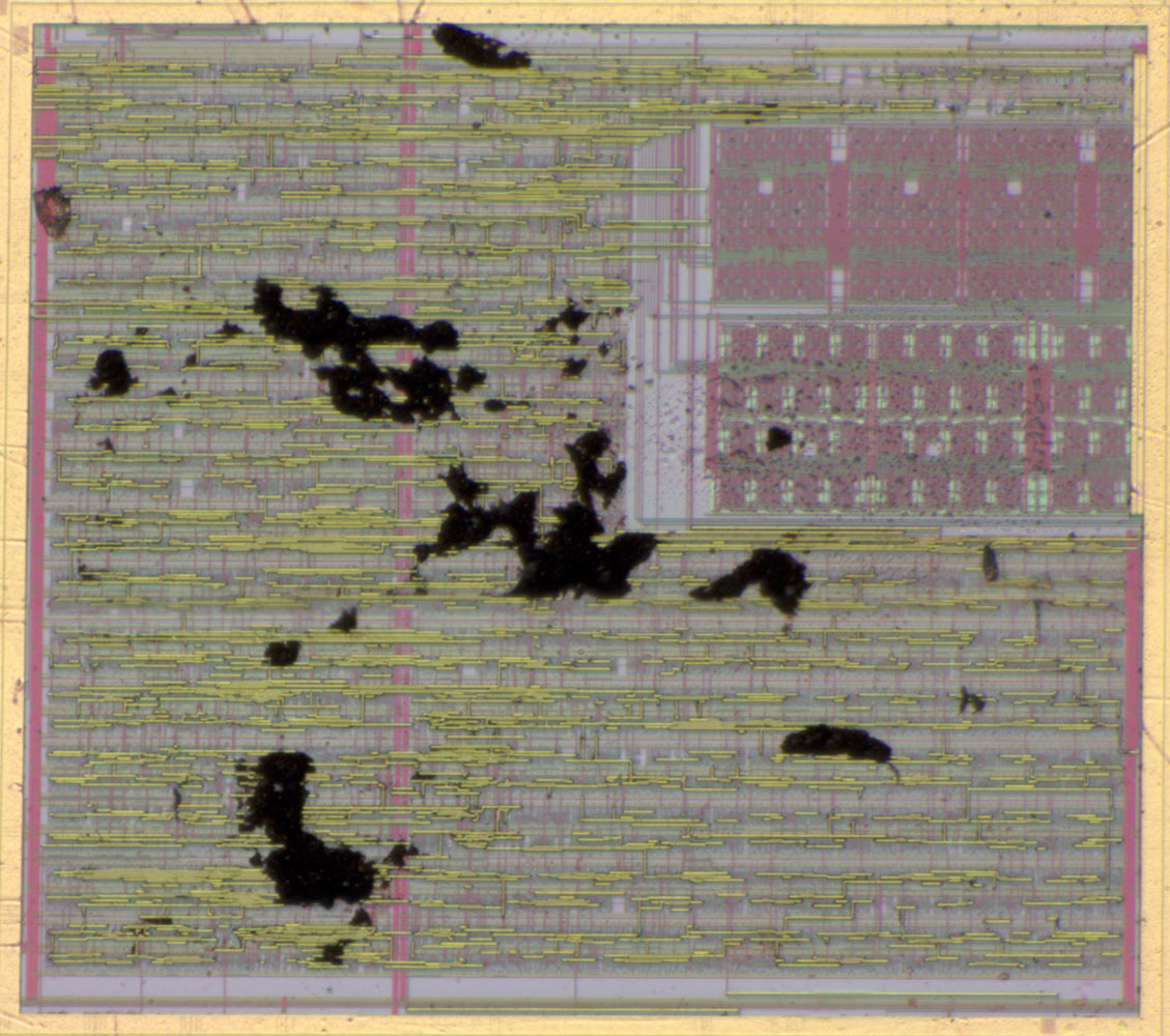 Den größten Teil des Dies nimmt eine Logikschaltung ein, die aus Standardzellen aufgebaut ist. Der Schaltungsteil in der oberen rechten Ecke setzt sich optisch deutlich ab.