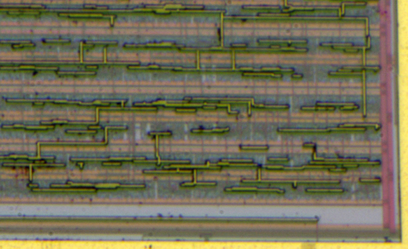 Trotz der kleinen Strukturen kann man erahnen, dass die Logikschaltung aus klassischen Doppelzeilen aufgebaut ist. An der rechten Kante verlaufen rötliche Hauptversorgungsleitungen, die in regelmäßigen Abständen horizontal verlaufende Versorgungsleitungen kontaktieren. Zwischen den horizontalen Versorgungsleitungen befinden sich die chaotisch erscheinenden Verbindungen der dort ebenfalls integrierten Standardzellen, was insgesamt die gewünschte Logikschaltung erzeugt. Die Verbindung der Standardzellen erfolgte mindestens in zwei, wahrscheinlich in mehr Ebenen. Die deutlich dickeren Verbindungleitungen in der obersten Ebene sind gut zu erkennen.