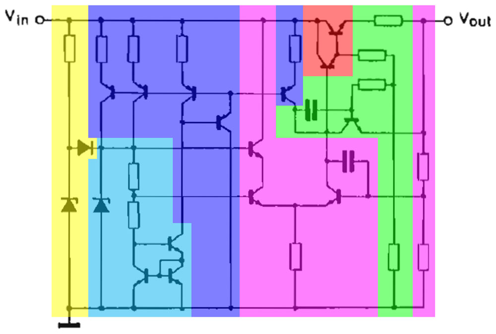 Die Regelung übernimmt ein Differenzverstärker (lila), der die Spannung eines Spannungsteilers am Ausgang mit der internen Referenzspannung vergleicht. Ein Kondensator begrenzt den Frequenzbereich. Im linken Pfad befinden sich zwei Transistoren übereinander. Anscheinend soll diese Kaskoden-Verschaltung den Differenzverstärker von Spannungsschwankungen am Eingang isolieren.